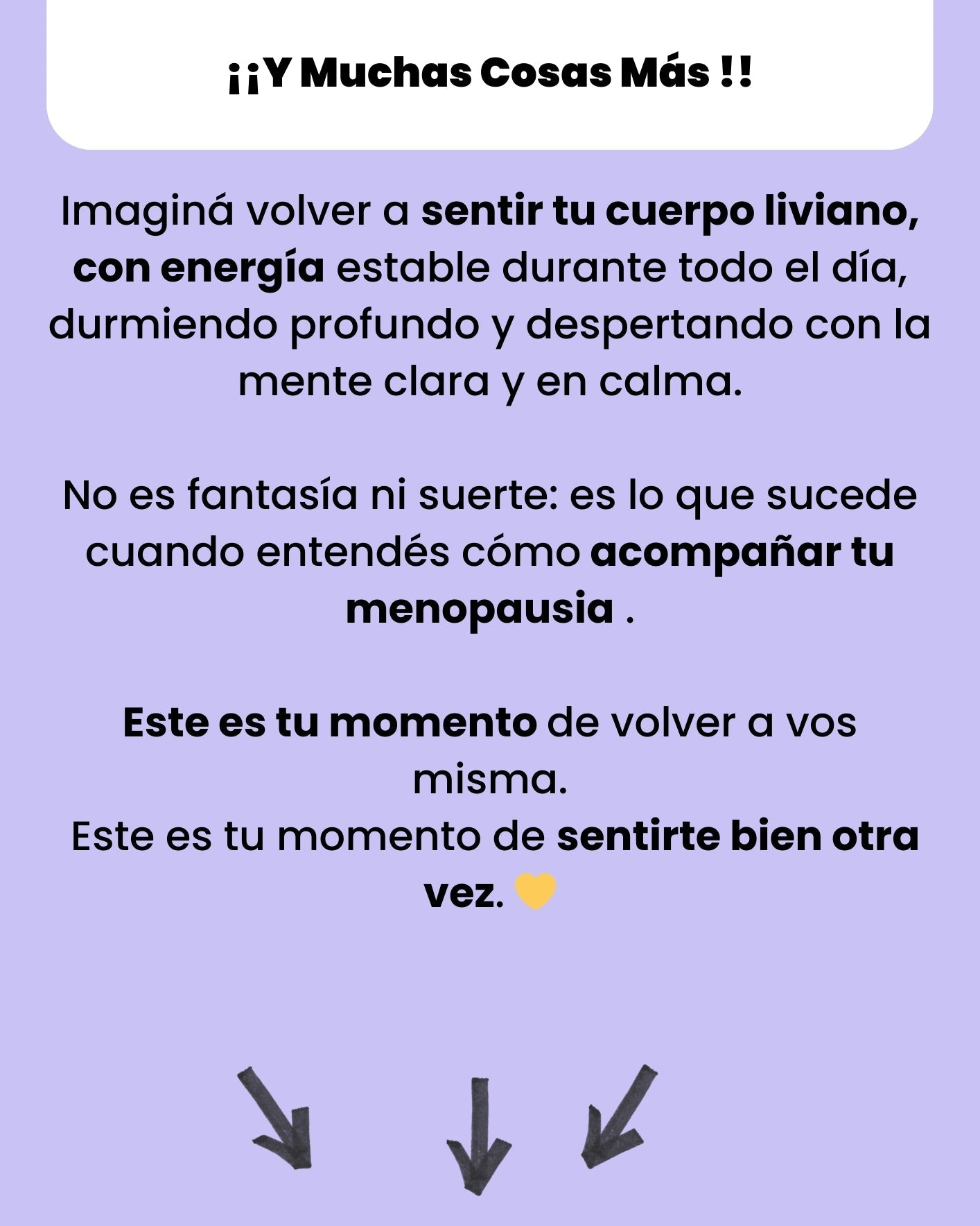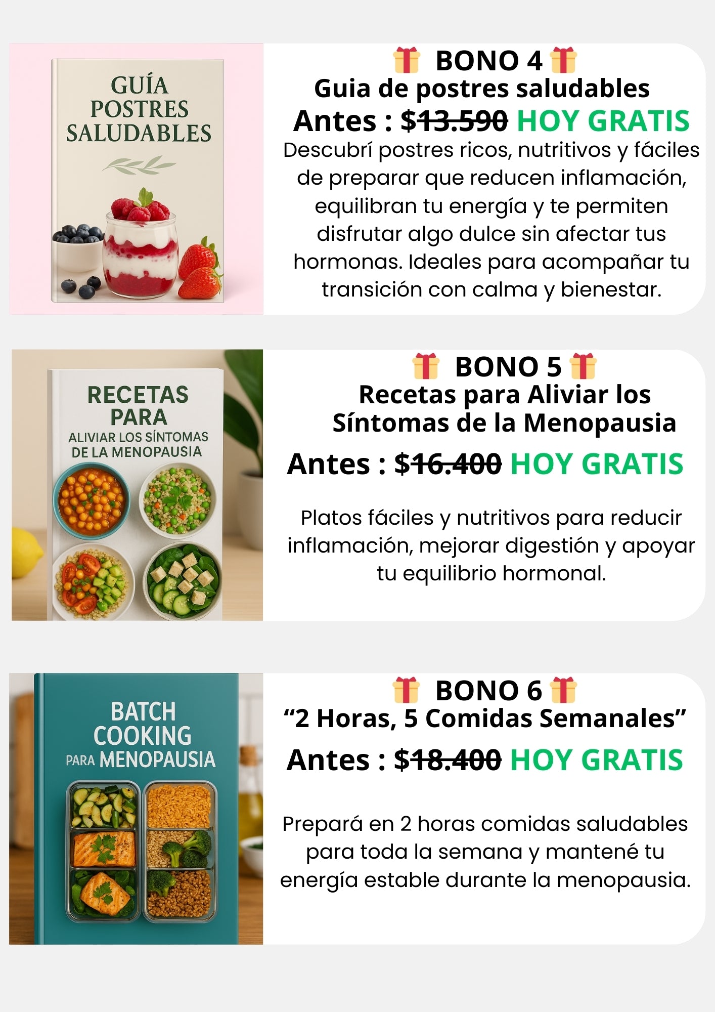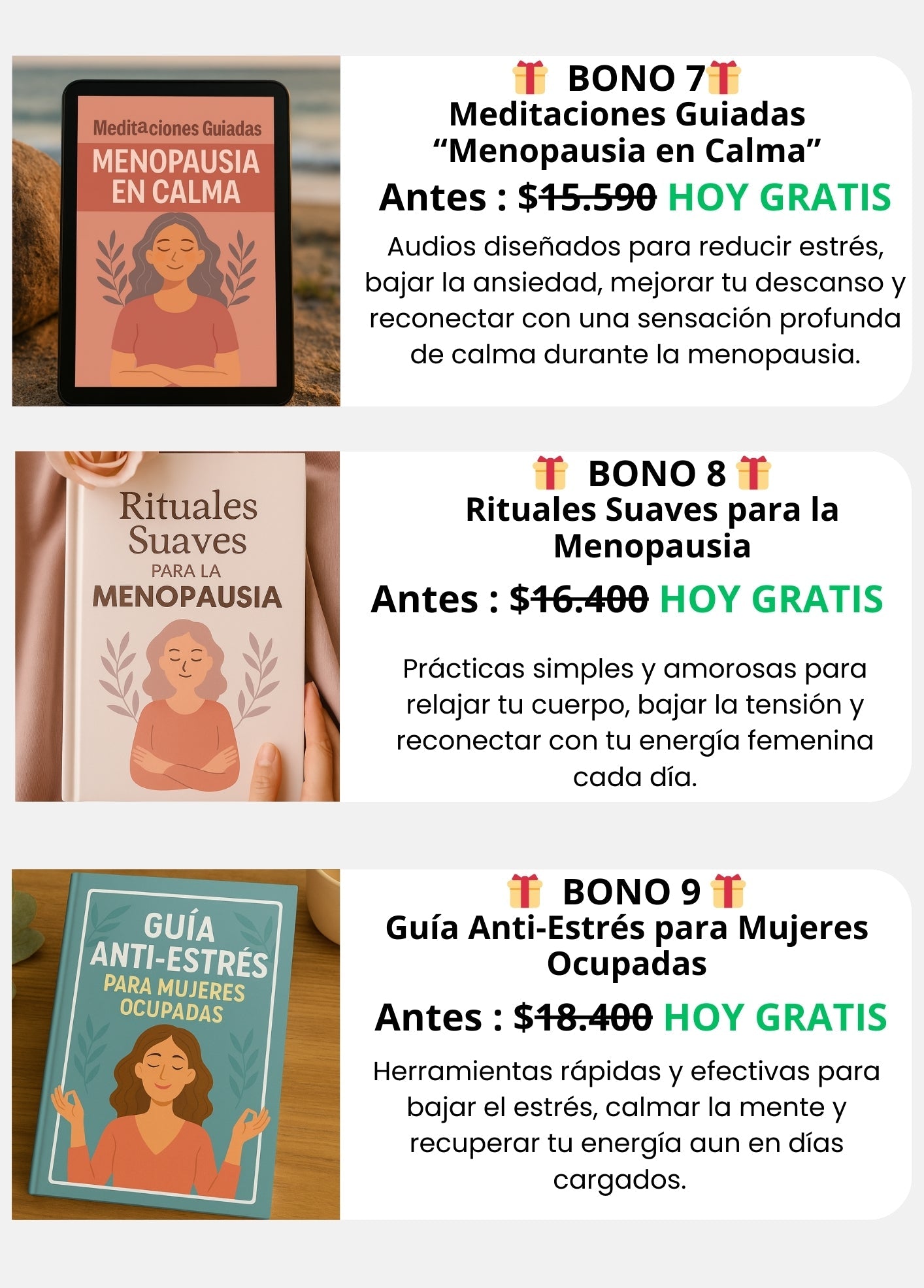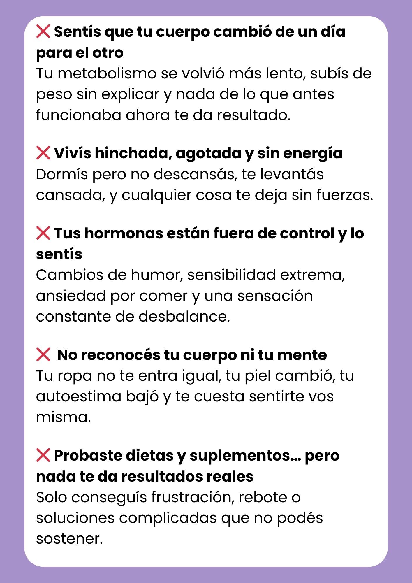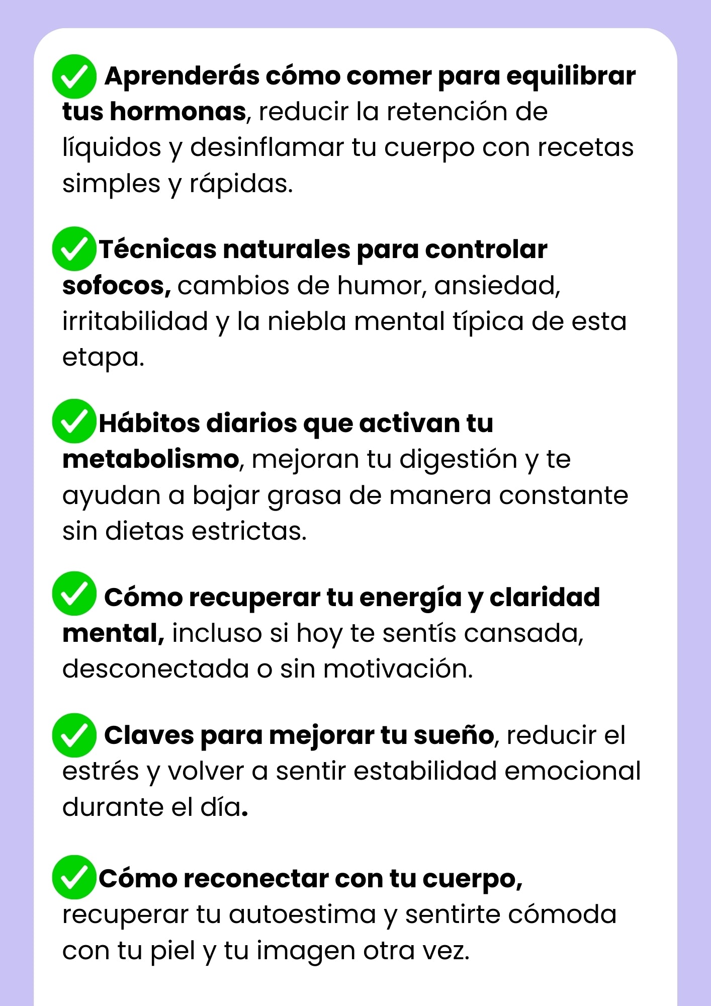 No. El método está pensado para mujeres ocupadas. Las recetas son de pocos ingredientes, las rutinas llevan minutos y los cambios no requieren “organizar tu vida”, sino ajustar pequeñas cosas que generan un efecto enorme. Si tenés 10 minutos al día, podés hacerlo.
